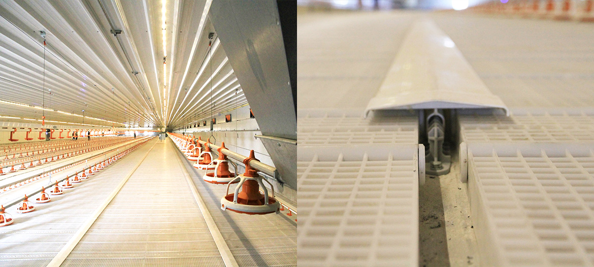 The use of this plastic slat together with the step-by-step or rollover scraper ensures optimised hygiene levels and reduced ammonia levels within the internal climate of the poultry house.